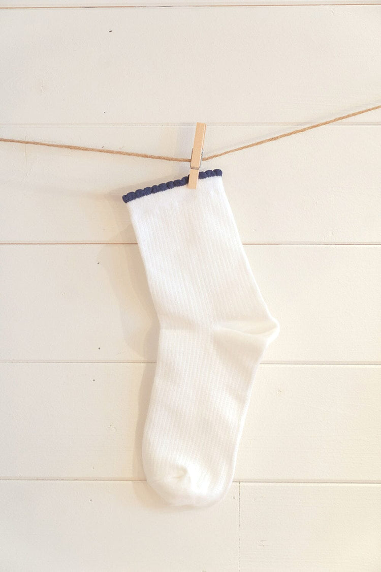 Soft white basic ankle socks with navy blue trim.All accessories are final sale.Fabrics: 80% cotton, 20% spandexMeasurements: One sizeMade In: China