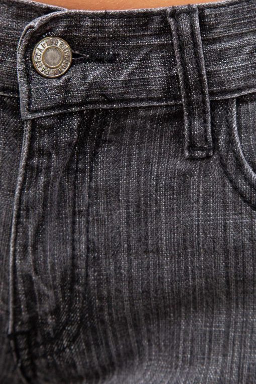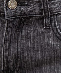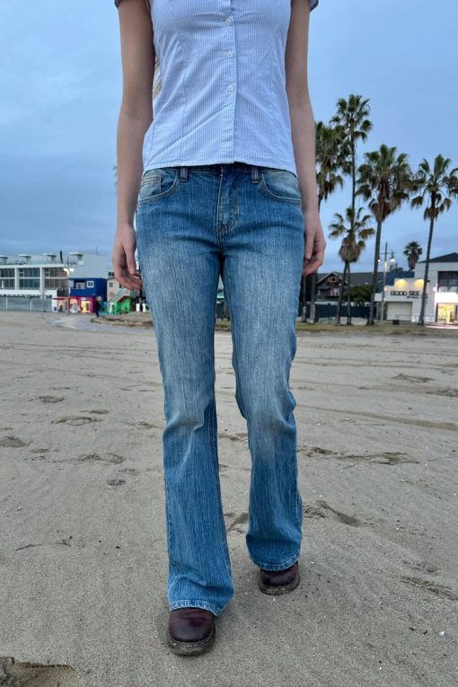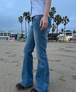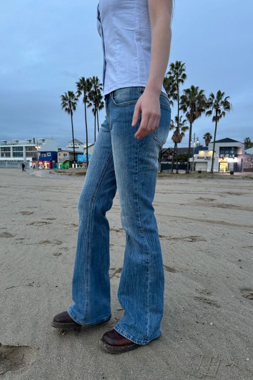 Low rise 90's denim flare leg tight fit jeans with brown stitching, 5 pockets, belt loops, and a button and zipper closure. Fabrics: 99% cotton, 1% elastane Measurement: 9.5″ (24 cm) rise, 33″ (84 cm) inseam, 30″ (76 cm) waist Made in: China