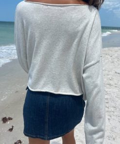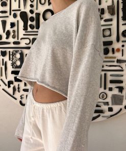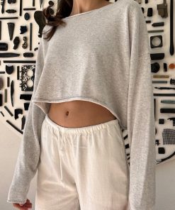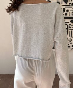 Lightweight soft cropped wide neck sweater with raw hem.Fabrics: 100% cotton Measurement: 17.5″ (44cm) length, 28″ (71cm) bustMade in: China