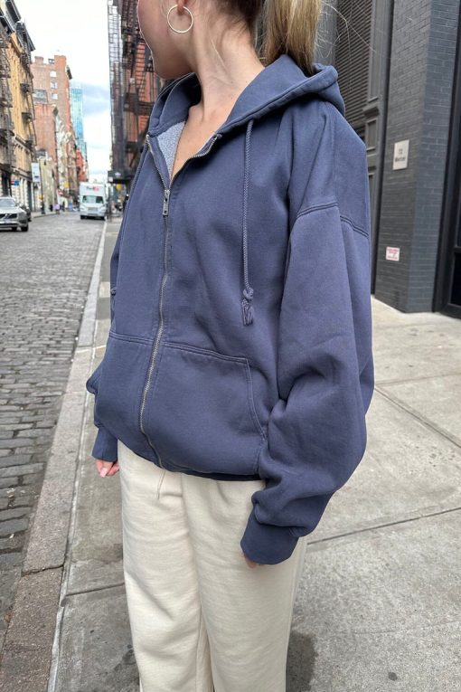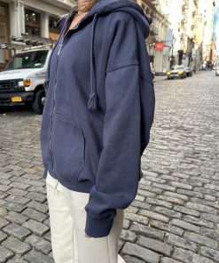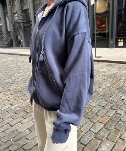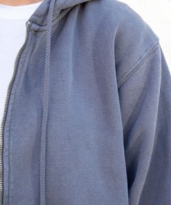 Basic, zip-up hoodie in faded navy blue with two pockets and a drawstring hood. Fabrics: 70% cotton, 30% polyester Measurements: Regular Fit: 25″ (64 cm) length, 23″ (58 cm) bust Oversized Fit: 29″ (74 cm) length, 28″ (71 cm) bust Made In: China