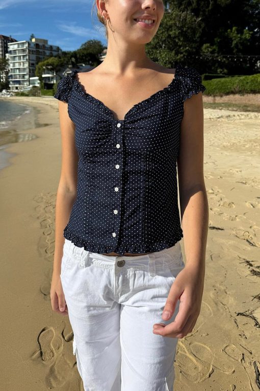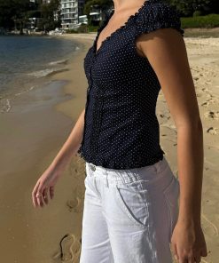 Short sleeve polka dot cotton top with ruffle detailing, a seem under the bust, button up.Fabrics: 97% cotton, 3% spandexMeasurements: 17″ (44 cm) length, 14″ (36 cm) bustMade in: Europe