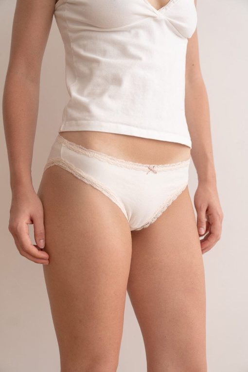 Soft cotton undies with a lace trim and bow.All intimates are final sale.Fabrics: 96% cotton, 4% elastaneMeasurement: 9.5″ (24cm) rise, 28″ (71cm)waist (stretches)Made in: Italy