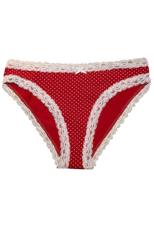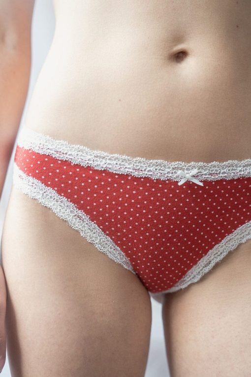 Soft, polka dots, cotton underwear with an elastic waistband, lace trim and a bow. All intimates are final sale.Fabrics: 96% Cotton, 4% ElastaneMeasurement: 9.5″ (24 cm) rise, 28″ (71 cm) waist (stretches)Made in: Europe