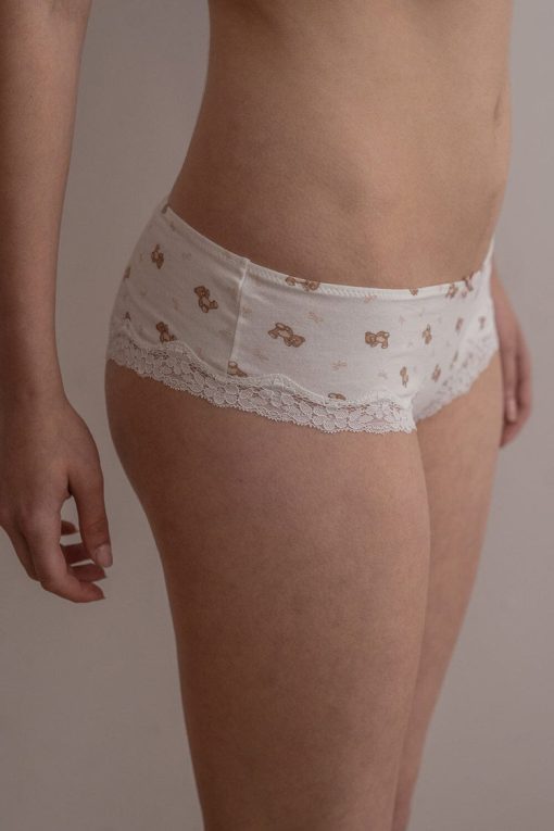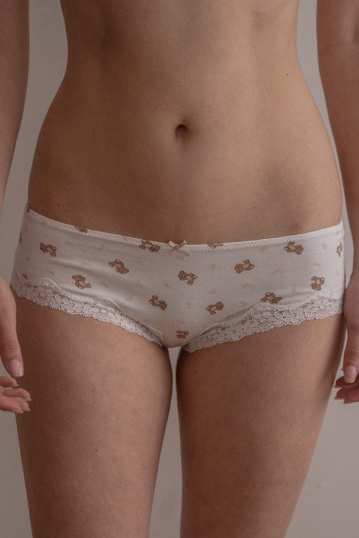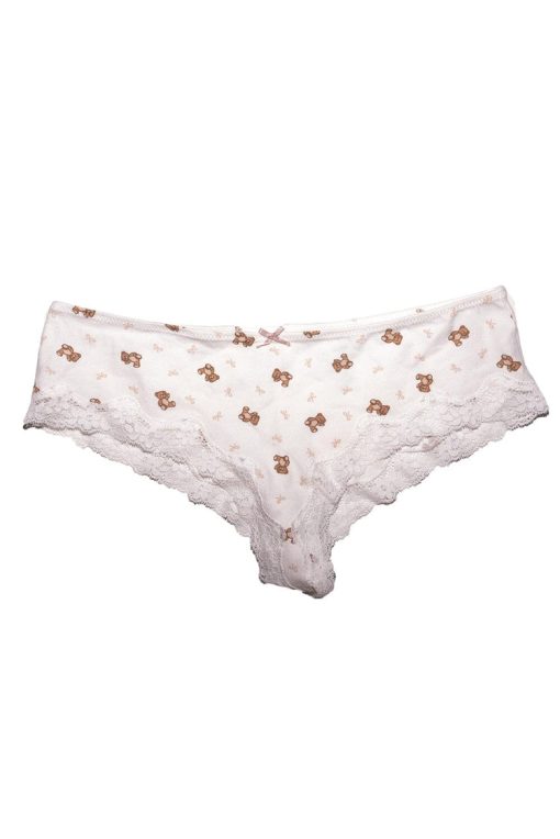 Soft cotton undies with a lace trim and a teddy bear and pink bows pattern.All intimates are final sale.Fabrics: 96% cotton, 4% elastaneMeasurement: 9.5″ (24cm) rise, 28″ (71cm)waist (stretches)Made in: Italy