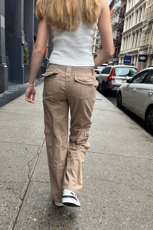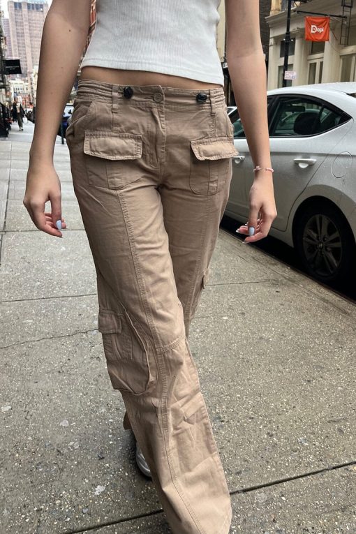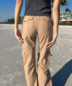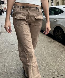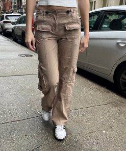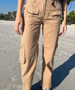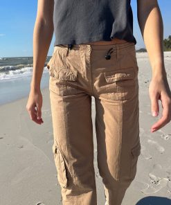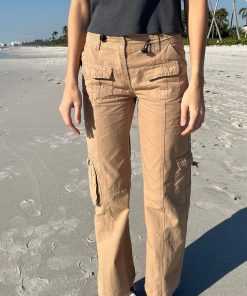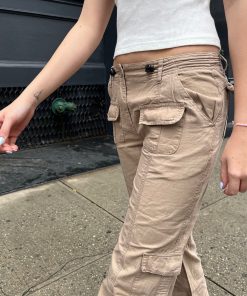 Low-rise, cargo pants with front and back pockets, two pockets on the side leg, an adjustable drawstring waist and a straight leg fit.Fabrics: 100% cottonMeasurements: 9″ (23 cm) rise, 28″ (71 cm) inseam, 27″ (69 cm) waist.Made in: China